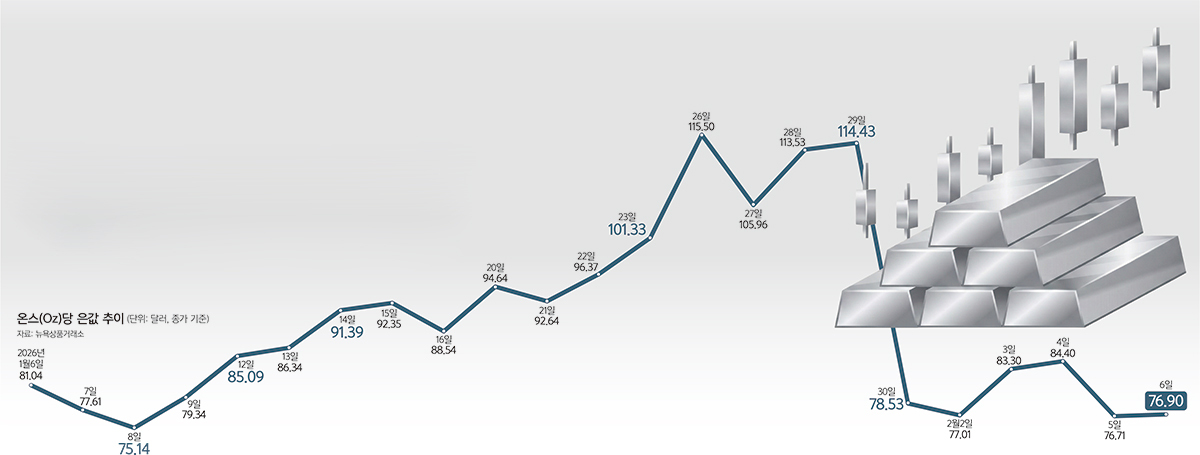온스당 장중 120달러를 돌파하며 사상 최고치를 경신한 은값이 하루 만에 31% 폭락하는 등 변동성 확대 구간에 진입했다. 120달러 고점에서 70달러 중반까지 밀리는 데 불과 열흘이 걸렸다. 지난해에만 150%라는 기록적 상승률을 보인 은이 새해 들어서도 폭주하다 조정 구간에 들어선 모습인데, 높은 수익률만큼이나 변동성이 큰 자산인 만큼 투자 시 주의가 필요하다.