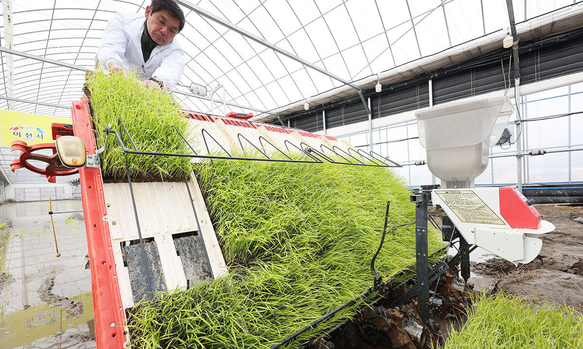 10일 경기도 이천시 호법면 안평리 비닐하우스 논에서 열린 ‘임금님표 이천 쌀 첫 모내기 행사’에서 행사 관계자가 이앙기로 모판을 옮기고 있다.