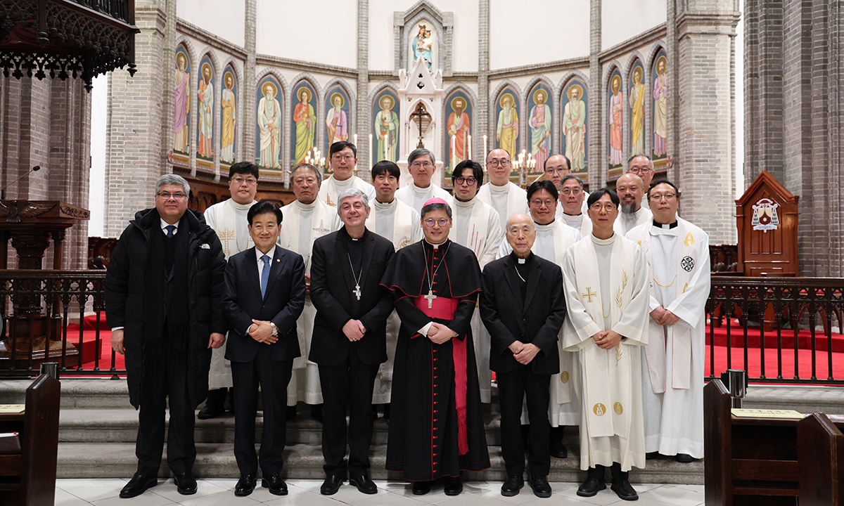 서울 중구 명동대성당에서 지난 10일 열린 ‘민족의 화해와 일치를 위한 미사’ 제1500회가 끝난 후 정순택 대주교(앞줄 가운데)를 비롯한 주한 교황대사 조반니 가스파리 대주교, 최창무 대주교, 정동영 통일부 장관(왼쪽 두번째)과 참석 내빈들이 기념촬영을 하고 있다. 남북 평화를 기원하며 1995년 3월 7일 고(故) 김수환 추기경 집전으로 시작한 이 미사는 31년간 매주 화요일 봉헌됐다.