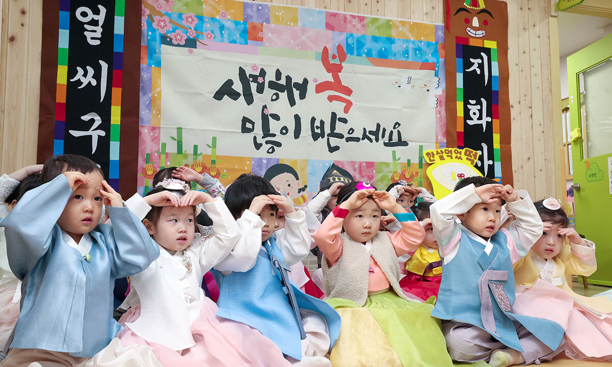 11일 서울 송파구 삼성아트어린이집에서 한복을 곱게 차려입은 원아들이 인근 경로당을 방문하기에 앞서 세배 연습을 하고 있다.