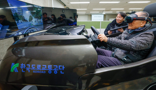 11일 서울 강서구 강서운전면허시험장에서 한 고령 운전자가 눈에 가상현실(VR) 장비를 착용한 채 운전석에 앉아 운전 능력을 측정하고 있다. 경찰청과 한국도로교통공단은 고령운전자를 대상으로 한 ‘실차 및 가상환경 기반 운전능력진단시스템’ 시범 운영에 들어갔다.