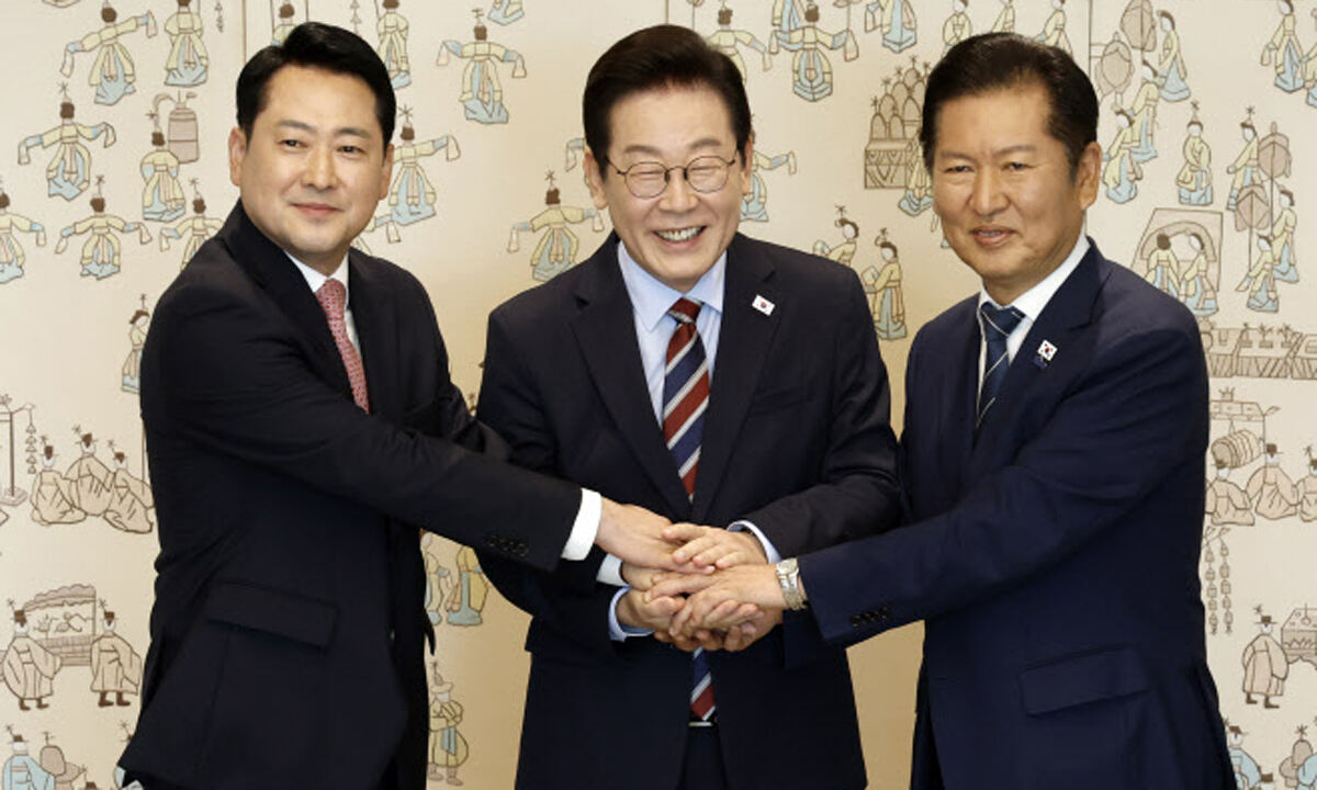 2025년 9월 8일 이재명 대통령이 서울 용산 대통령실 청사에서 열린 여야 지도부 오찬 회동에서 정청래 더불어민주당 대표, 장동혁 국민의힘 대표와 기념촬영을 하고 있다. 뉴시스
