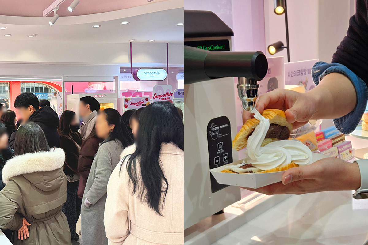 먼저 체험 공간을 전면에 내세운 점이 가장 눈에 띄었다. 기존 편의점에선 볼 수 없었던 ‘DIY존’에서는 고객이 직접 오븐형 에어프라이어와 휘핑크림 디스펜서, 각종 토핑을 이용해 자신만의 디저트를 만들 수 있다. 크루아상 위에 초코시럽만 가득 올리거나 인근 ‘과일 자판기’에서 신선한 과일을 구매해 과일을 넣어먹는 이들도 있었다. ‘나만의 크림빵 챌린지’ 이벤트도 진행돼 ‘꿀조합’ 인증 사진을 찍기도 했다. 토핑과 크림이 무료로 제공돼 대기줄이 이어졌다.