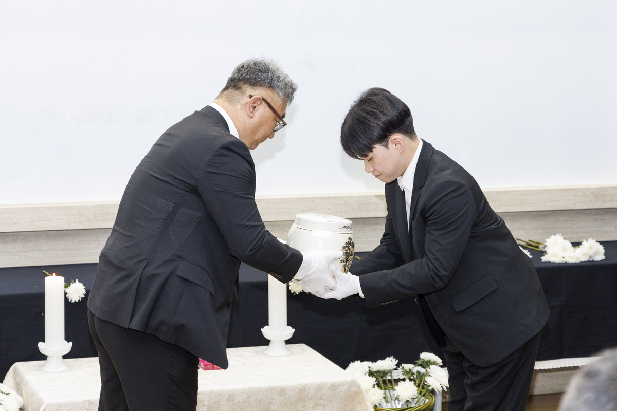 행사는 손명주 해부학교실 주임교수의 개회사로 시작해 △헌화 및 분향 △기증인을 위한 묵념 △정재연 총장 추도사 △기증인 유골 전달 및 봉안시설(납골당) 안치 등의 순으로 엄숙하게 진행됐다.
