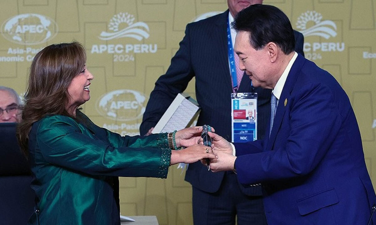 재임 기간이 3년도 안 되는 윤석열 전 대통령의 마지막 국외 출장은 2024년 11월 14∼21일 이뤄진 남미 순방이다. 당시 윤 대통령은 페루 리마에서 열린 아시아태평양경제협력체(APEC·에이펙) 정상회의에 참석했다. 한국보다 꼭 1년 먼저 에이펙 의장국을 맡은 페루의 디나 볼루아르테 대통령은 에이펙의 오랜 관행에 따라 회의 마지막 날 차기 의장국인 한국의 윤 대통령에게 의사봉을 전달했다.