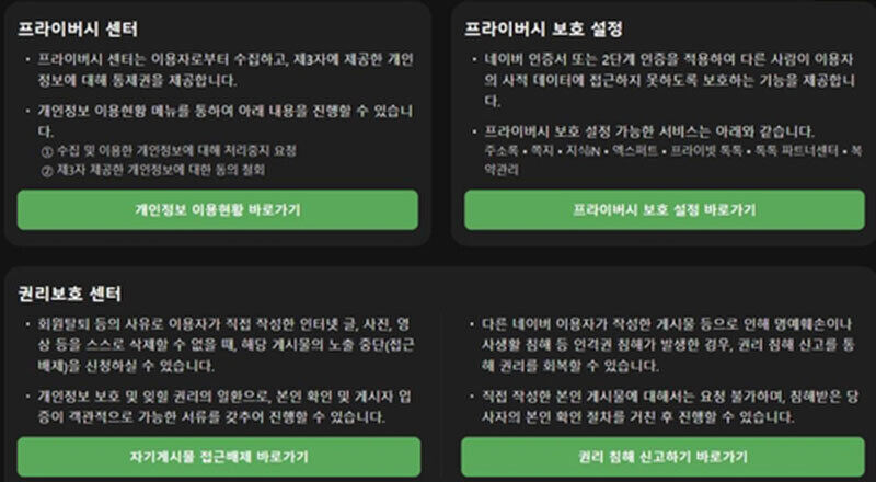 개인정보 이용현황 바로가기 탭을 이용해 맞춤형으로 수집된 개인정보를 확인할 수 있다. 서비스별로 개인정보 처리 중지나 동의 철회가 가능하다. 아울러 권리보호센터는 이용자가 작성한 인터넷 글, 사진, 영상을 스스로 삭제할 수 없을 때 해당 게시물의 노출을 중지할 수 있게 했다. 다른 네이버 이용자가 작성한 게시물로 인해 명예훼손이나 사생활 침해 등 인격권 침해가 발생할 경우 권리보호센터에서 권리 침해 신고를 할 수 있다. 이때 직접 작성한 본인 게시물은 요청할 수 없고, 침해받은 당사자의 본인 확인절차를 거친 뒤 신고를 진행할 수 있다. 이 밖에 개별 서비스마다 본인 게시물을 삭제할 수 있는 기능도 내 데이터 관리도구 페이지에 추가됐다.