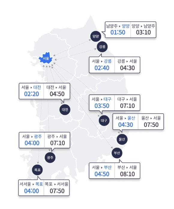 광주 요금소에서 서울 요금소까지는 7시간 10분이 걸릴 전망이다. 목포 요금소에서 서서울 요금소까지는 7시간 50분, 울산 요금소에서 서울 요금소까지는 7시간 50분, 대구 요금소에서 서울 요금소까지는 7시간 10분이 소요된다.