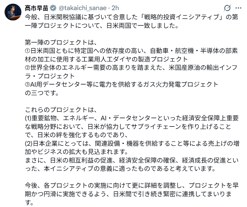 다카이치 총리는 이날 엑스(X)에 올린 글에서 “일·미(미·일) 관세 협의에 기초해 합의한 ‘전략적 투자 이니셔티브’의 제1호 프로젝트에 양국이 일치했다”며 이 같이 밝혔다.