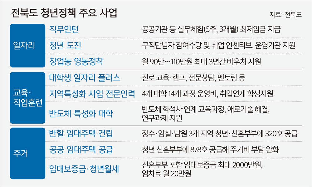 전북도는 일자리와 교육·직업훈련, 주거, 금융·복지·문화, 참여·기반 등 5개 분야로 정책을 체계화했다. 이 중 일자리 분야에 전체 예산의 62%인 2229억원을 배정해 청년 9000여명에게 직접적인 기회를 제공할 예정이다.