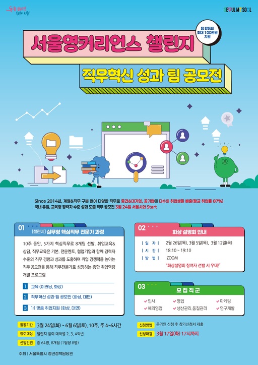 서울시가 대학 재학생들에게 현장실습, 인턴 등의 경험을 쌓을 기회를 제공하는 ‘서울영커리언스 캠프(부트캠프)·챌린지(팀 공모전)’ 참여자를 모집한다.