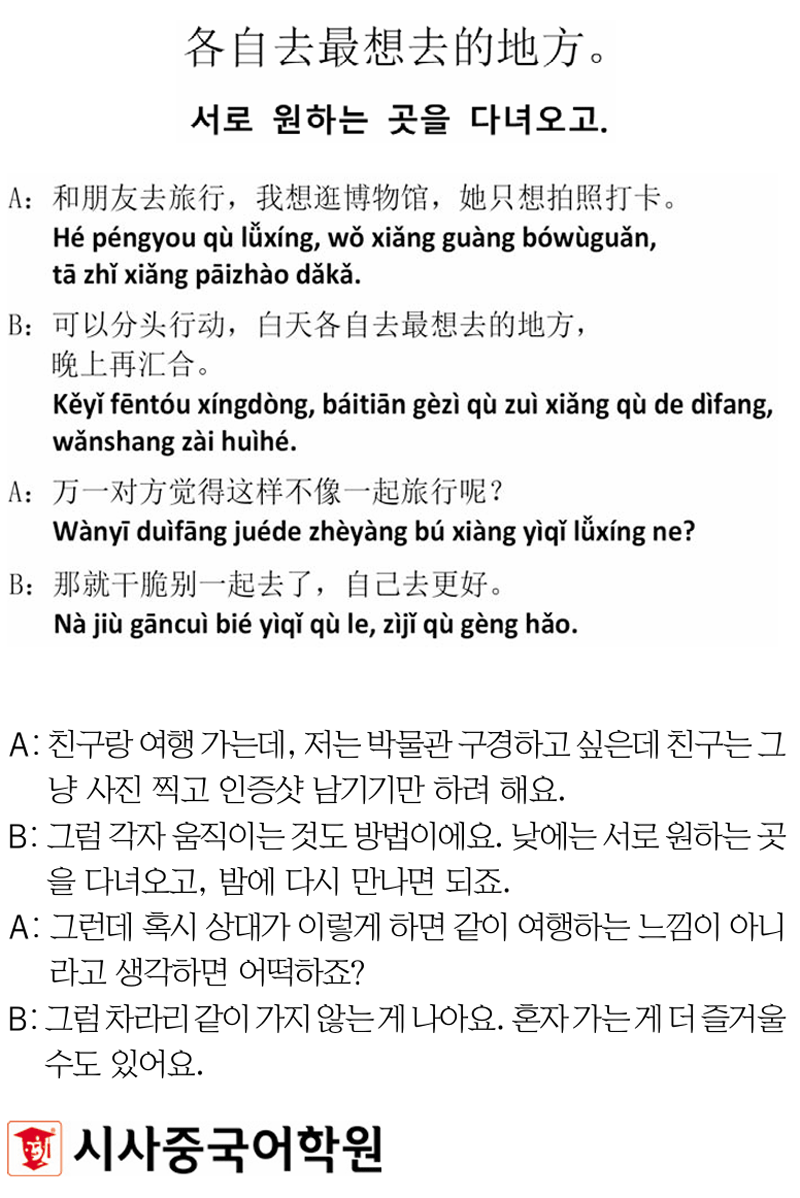 [시사중국어학원의 리얼 중국어 회화] 서로 원하는 곳을 다녀오고.