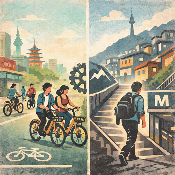 주변의 많은 중국인 유학생도 비슷한 질문을 던진다. “왜 한국 사람들은 자전거를 많이 타지 않을까?” 하고 말이다. 하지만 이들도 곧 서울의 언덕 지형과 지하철 중심의 이동 방식에 익숙해진다. 중국에서 익숙했던 생활 방식을 그대로 유지하려고 하면 적잖은 어려움을 겪는다. 2019년 중앙대학교에서 석사 과정을 밟고 있던 시절의 일이다. 한 중국인 동기가 등하교 시간을 줄이기 위해 전동 킥보드를 구입했다가 학교 정문 앞 언덕에서 넘어져 발목과 팔을 크게 다쳐 수술까지 받았다. 지금은 수원에 정착해 살고 있는 그 친구는 이 이야기를 꺼내면 웃으며 다시는 한국에서 킥보드를 타지 않겠다고 말한다.