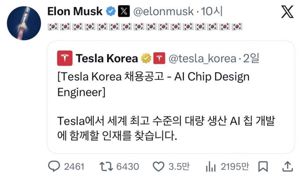 머스크는 17일(현지시간) 자신의 X(옛 트위터)에 테슬라코리아의 AI 칩 디자인 엔지니어 채용 공고를 공유하며 16개의 태극기 이모티콘을 올렸다. 그는 “만약 당신이 한국에 거주하고 있고 칩 디자인, 패브리케이션(팹), AI 소프트웨어 분야에서 일하고 싶다면 테슬라에 지원하라”고 적었다. 지난 15일 테슬라코리아는 “세계 최고 수준의 대량생산 AI 칩 개발에 함께할 인재를 찾는다”고 채용 공고를 냈다.