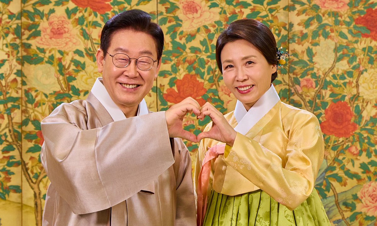 이재명 대통령과 배우자 김혜경 여사가 17일 공개된 설 맞이 인사 영상에서 한복을 입은 채 손 하트를 만들며 국민들에게 새해 인사를 전하고 있다. 이 대통령은 “국민께서 원하는 대한민국의 모습을 이정표 삼아 한 걸음 한 걸음 흔들림 없이 걸어가겠다”고 밝혔다.