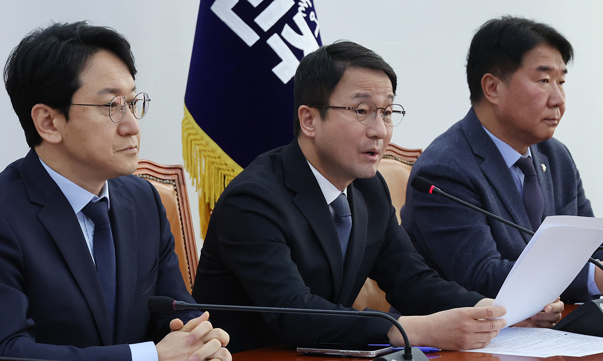 더불어민주당 한병도 원내대표가 18일 서울 여의도 국회에서 열린 현안 기자간담회에서 설 연휴 이후 주요 민생·개혁법안 처리 방향 등에 대해 설명하고 있다. 왼쪽부터 천준호 원내운영수석부대표, 한 원내대표, 이기헌 원내대표 비서실장.