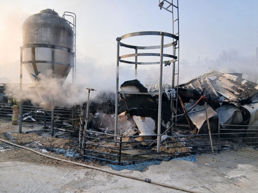 소방이 현장에 출동했을 때는 이미 축사가 화재로 소실돼 연기만 나는 상황이었다.