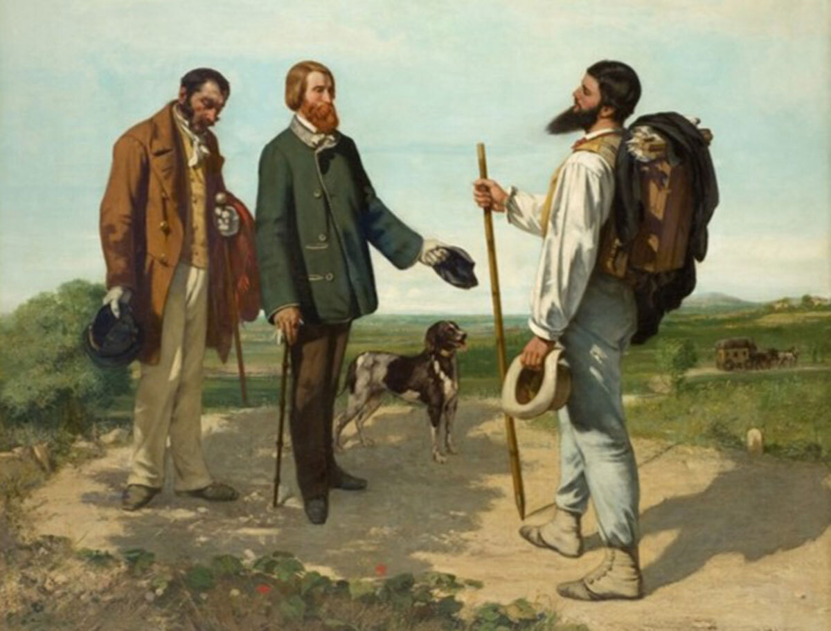 귀스타브 쿠르베가 사람들과 인사하며 얘기를 나누고 있다. 옆의 개도 쿠르베를 알아보고 반갑게 짖어댄다. 사람들이 쿠르베의 후원자와 그의 하인이라는 설명도 있고, 그저 평범한 이웃들이라는 설명도 있다. 누구였든지, 등 뒤 배낭 안에 이젤을 접은 막대기와 둥글게 말린 캔버스가 꽉 차 있는 걸 보면 쿠르베가 먼 길을 떠나려는 것 같다. 화면 오른쪽에 길 떠나는 마차도 그려 넣어 여행길의 분위기에 맞췄다.