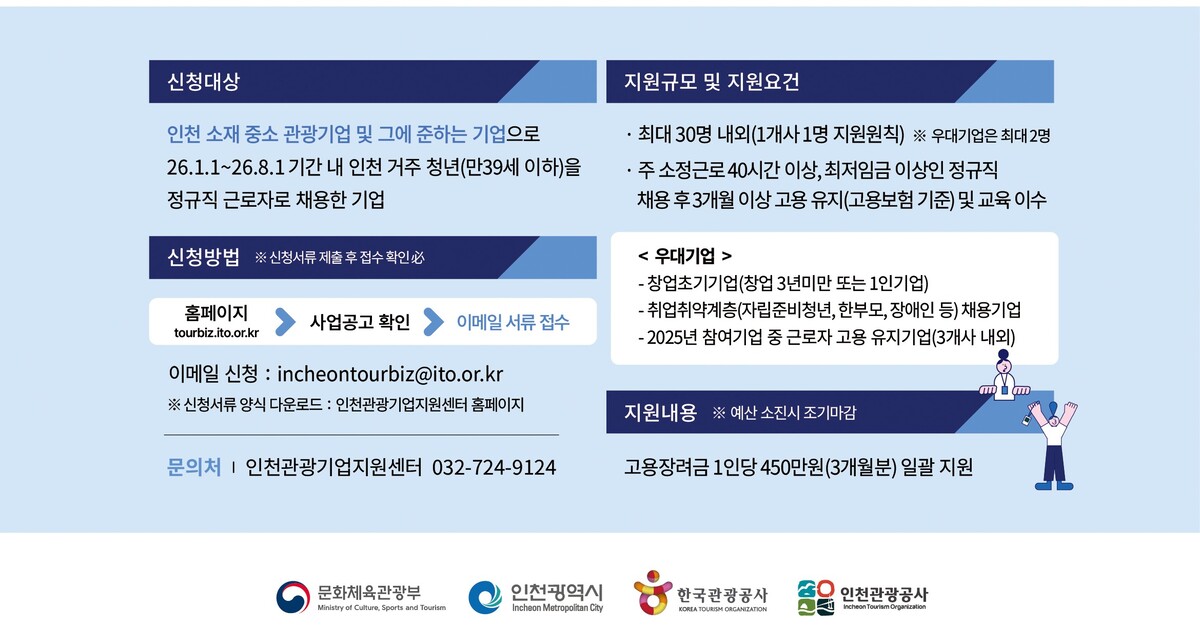 인천시가 지역 청년의 지속가능한 일자리 창출에 나선다. 시·인천관광공사는 ‘2026년 중·소 관광기업 고용장려금 지원사업’을 추진한다고 19일 밝혔다.