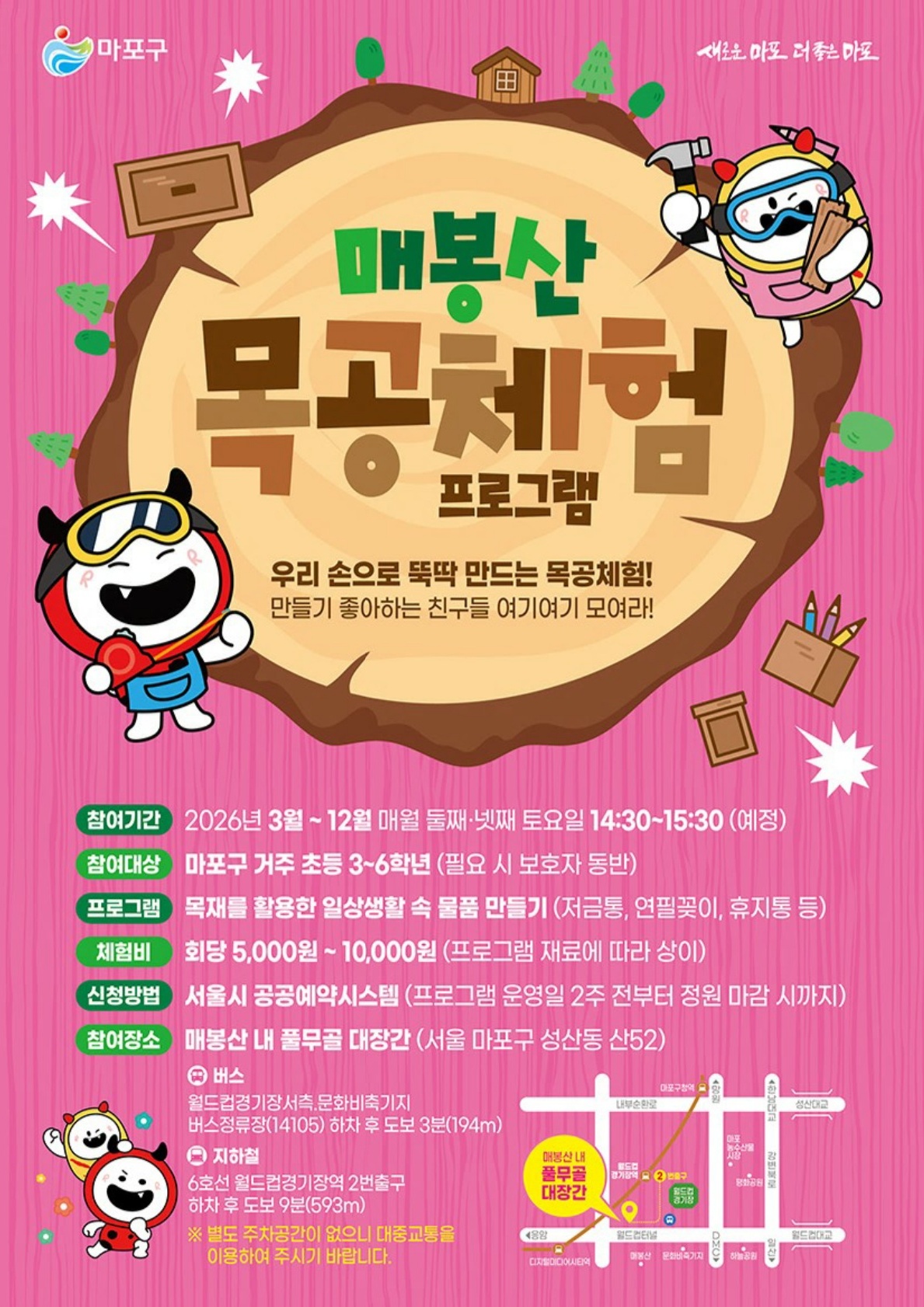 서울 마포구는 매봉산 내 풀무골 대장간(성산동 산52)에서 초등학교 3~6학년 어린이들을 대상으로 한 목공 체험 프로그램을 오는 11월까지 운영한다고 20일 밝혔다.
