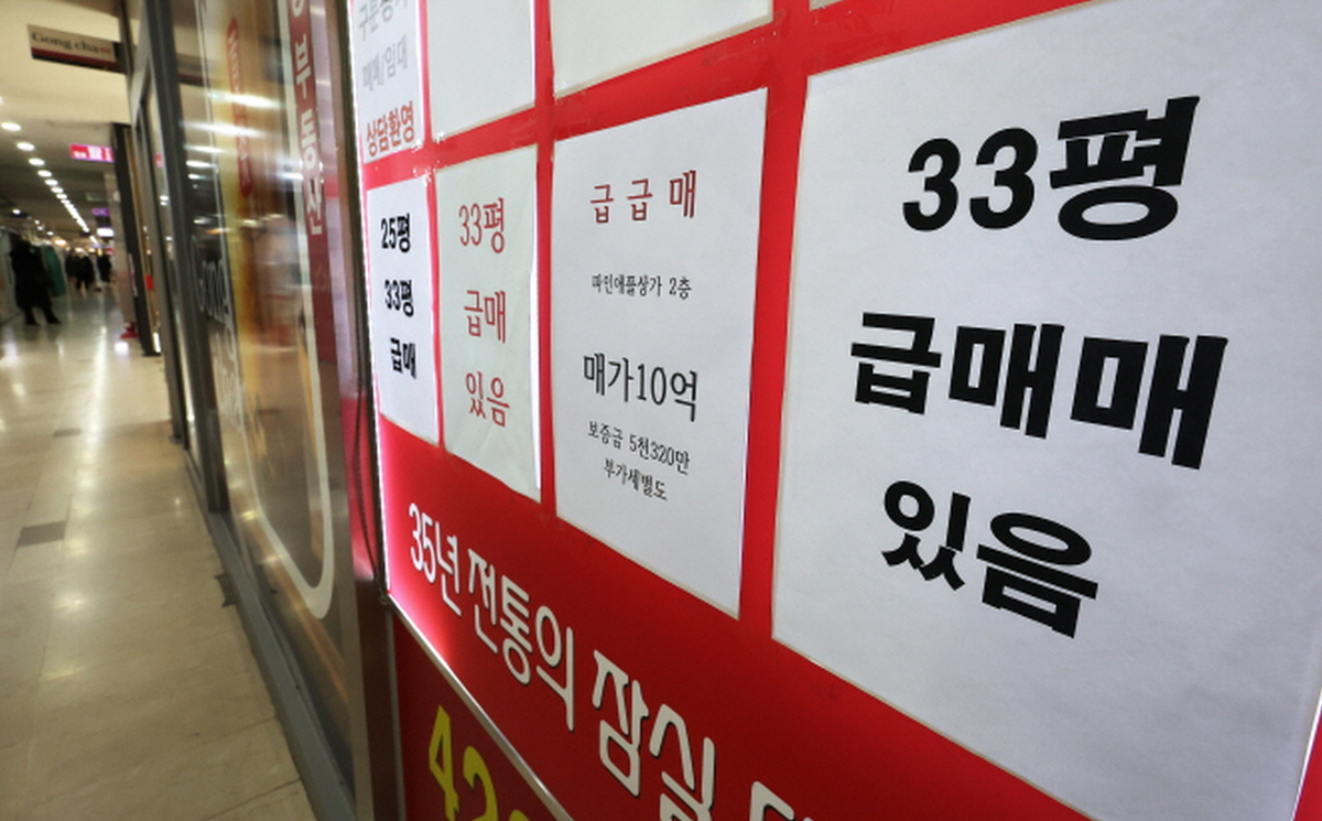 퇴근길, 아파트 단지 앞 부동산 유리창에 붙은 매물 전단지를 유심히 바라보던 30대 직장인이 조용히 스마트폰 앱을 닫고 발걸음을 돌린다.