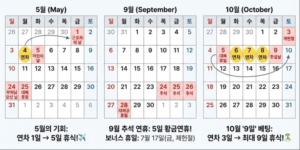 하반기는 굵직한 연휴 구간이 형성된다. 9월 추석 당일을 전후해 연차 3일을 쓰면 주말을 묶어 최대 9일간의 장기 휴식이 가능하다.