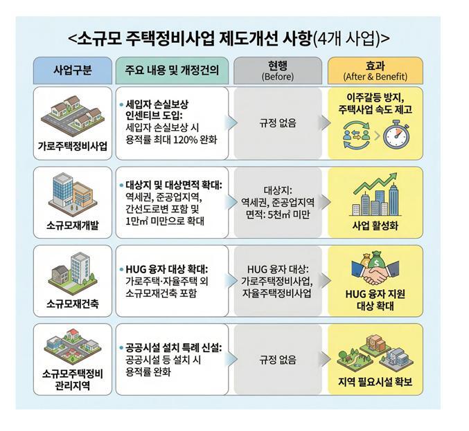 시는 가로 주택 정비 사업 추진 시 세입자 손실 보상과 관련해 용적률 완화 인센티브를 신설하고, 주택도시보증공사(HUG) 융자 대상에 소규모 재건축 사업을 포함해 달라고 요청했다. 또 소규모 재개발 사업 대상지 요건을 최대 면적 1만㎡ 미만, 역세권·준공업지역·간선도로변으로 완화하고, 합리적인 소규모 주택 정비 관리 계획 수립을 위해 국토계획법상 공공시설 설치 및 공공 기여 시 용적률 완화 근거를 신설해 줄 것을 건의했다.