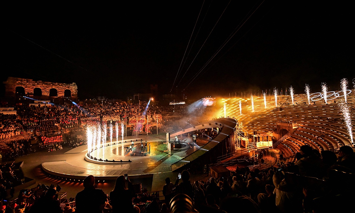 밀라노와 코르티나담페초를 밝혔던 올림픽 성화는 1994 릴레함메르 동계 올림픽 남자 크로스컨트리 스키 계주 금메달을 합작했던 전 이탈리아 대표팀 선수들에 의해 베로나 아레나에 도착했고, 오륜 모양의 구조물로 옮겨져 경기장을 환하게 밝혔다.