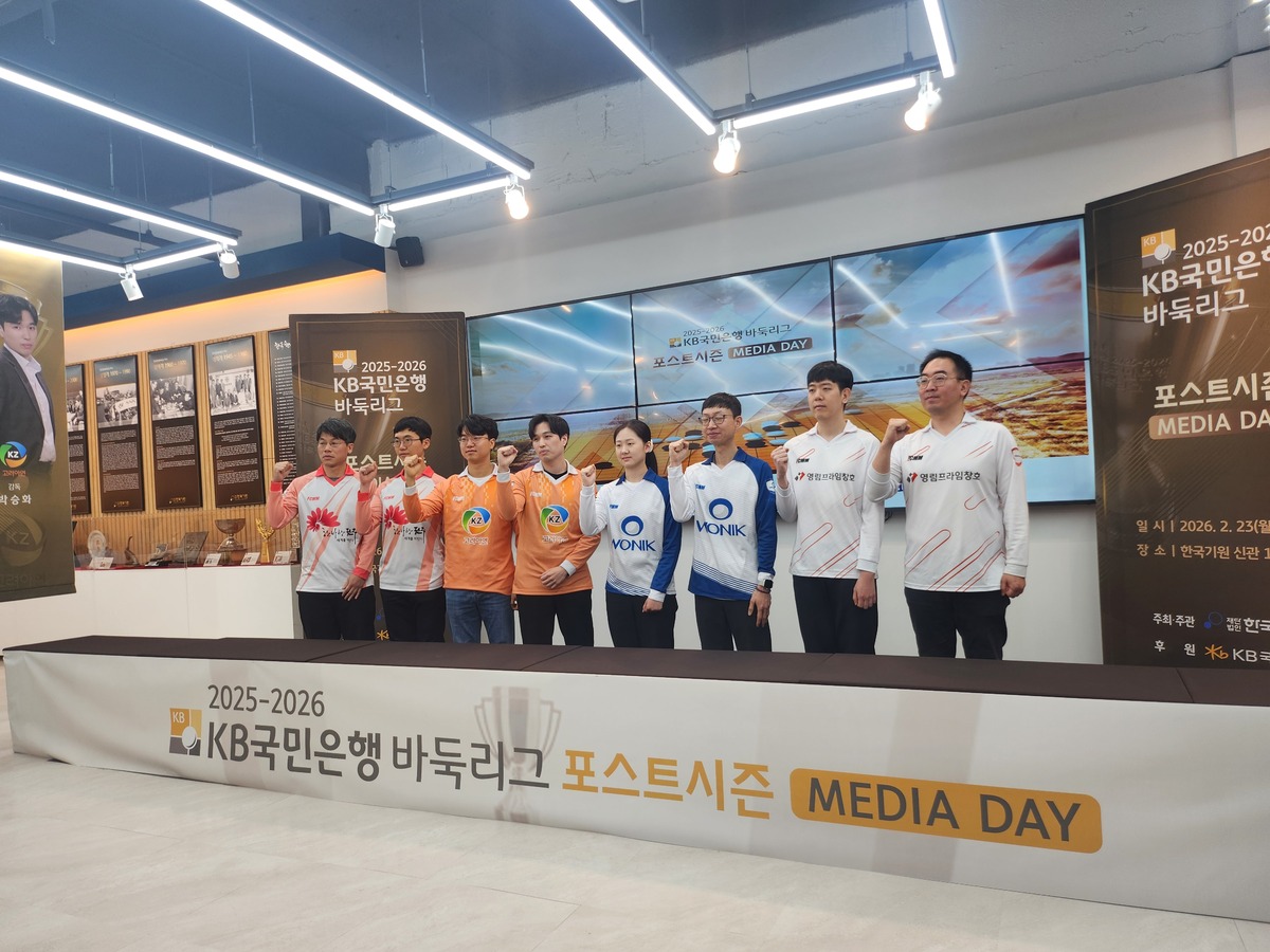한국기원은 23일 오전 서울 성동구 당사 신관에서 2025~2026 KB국민은행 바둑리그 포스트시즌 개막 기자간담회를 개최했다. 이날 행사엔 정규리그 순위 1위를 달리고 있는 울산 고려아연의 박승화 감독과 안성준 9단, 원익의 이희성 감독과 김은지 9단, 한옥마을 전주의 양건 감독과 변상일 9단, 영림프라임창호 박정상 감독과 강동윤 9단이 참석했다.