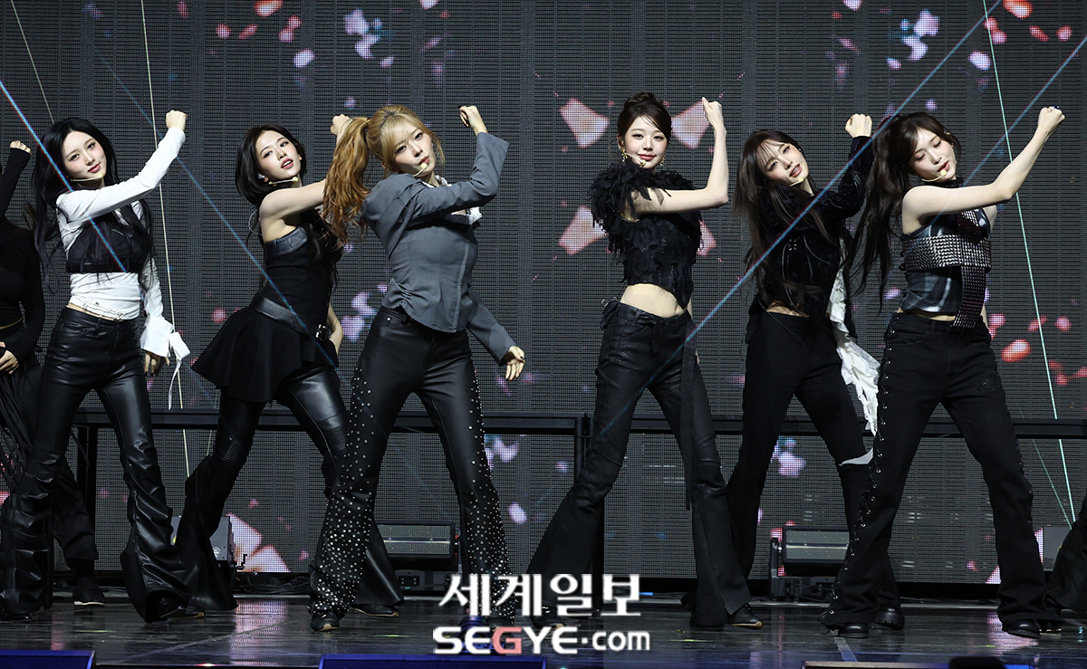그룹 아이브가 23일 오후 서울 광진구 예스24 라이브홀에서 진행된 정규 2집 ‘리바이브 플러스(REVIVE +)’ 발매 기념 미디어 쇼케이스에 참석해 열띤 공연을 펼치고 있다.