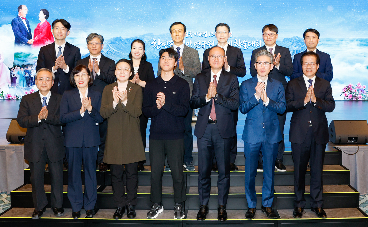 23일 경기 가평군 천원궁 다목적홀에서 열린 천일국 기원절 13주년 기념 한민족선민연구원 국제학술대회에서 참석자들이 기념 촬영을 하고 있다.