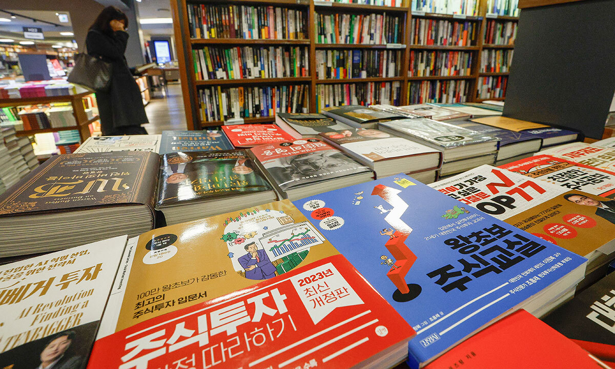 코스피가 장중 5900선을 돌파하며 역대 최고치를 기록한 23일 서울 종로구 교보문고 광화문점에 주식투자 관련 도서가 진열돼 있다. 금융투자협회에 따르면 투자자 예탁금은 지난달 27일 사상 처음으로 100조원을 넘어섰고, 주식거래 활동계좌 수는 1억개에 육박하고 있다.