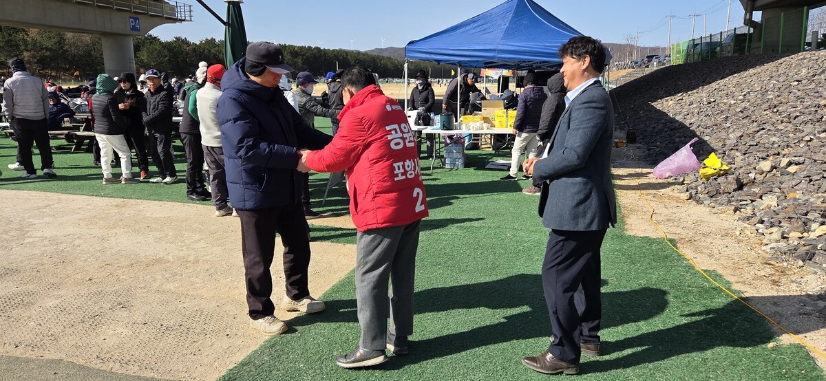 공원식 국민의힘 포항시장 예비후보는 23일 형산대교 앞에서 출근길 아침인사를 마친 뒤 형산강 파크골프장에서 열린 포항시 파크골프협회 주관 상반기 대표선수 선발전에 참석, 선수들을 격려했다고 밝혔다.