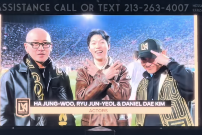 손흥민의 소속팀 LA FC와 리오넬 메시가 속한 인터 마이애미 CF의 맞대결로 화제가 된 경기다. 세 배우는 이날 중계 카메라와 전광판 등에 포착됐다.