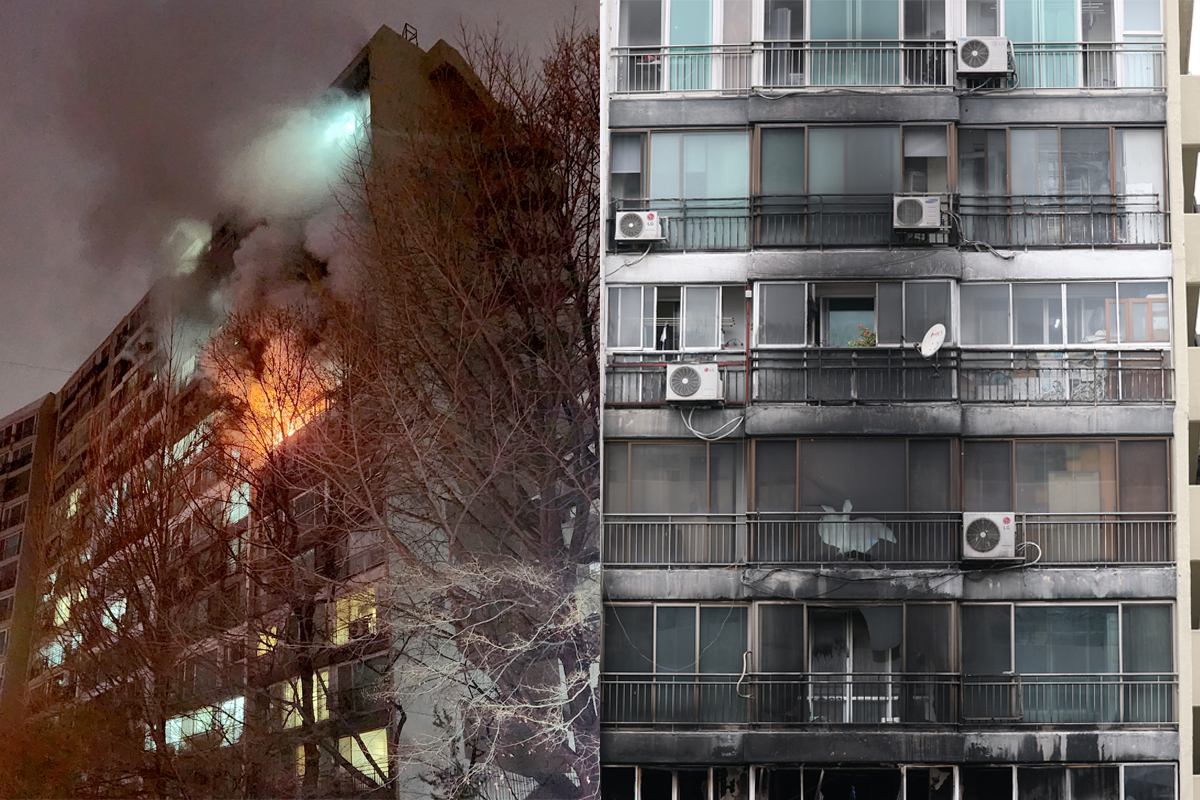24일 오전 서울 강남구 대치동 은마아파트에서 발생한 화재 당시 모습. 오른쪽은 외벽이 그을려 있는 모습. 연합뉴스