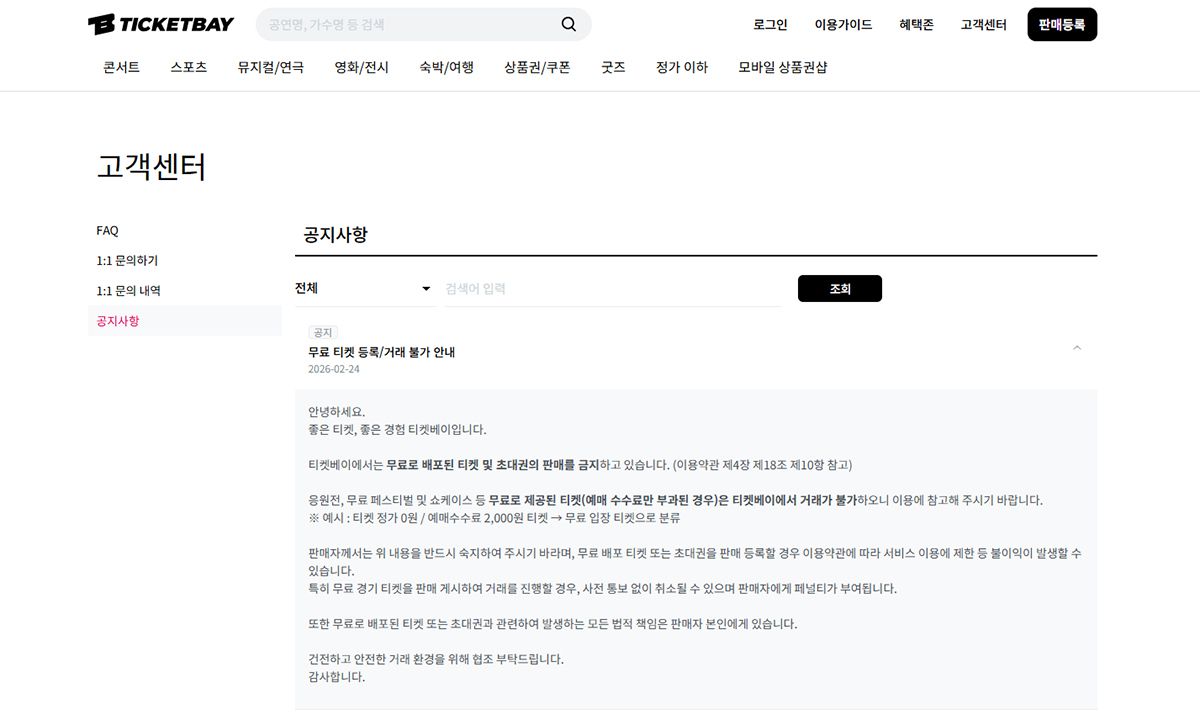 국내 최대 티켓 양도 플랫폼 티켓베이가 24일 ‘무료로 배포된 티켓 및 초대권의 판매를 금지하고 있다’는 내용의 공지를 올렸다.