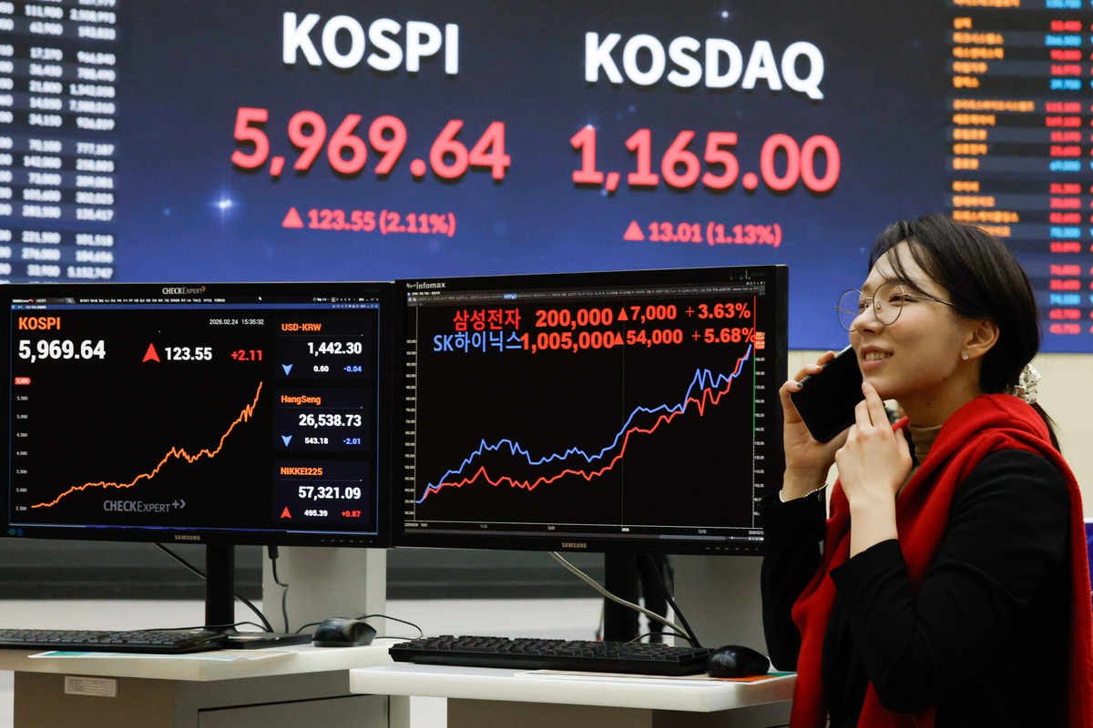 삼성전자와 SK하이닉스가 각각 20만·100만원을 돌파했다. 24일 삼성전자는 20만, SK하이닉스는 100만5000원으로 장을 마감했다. 코스피는 전 거래일보다 123.55(2.11%) 오른 5969.64로 장을 마감했다. 이날 서울 여의도 한국거래소 홍보관에서 관계자가 증시 상황을 지켜보고 있다.