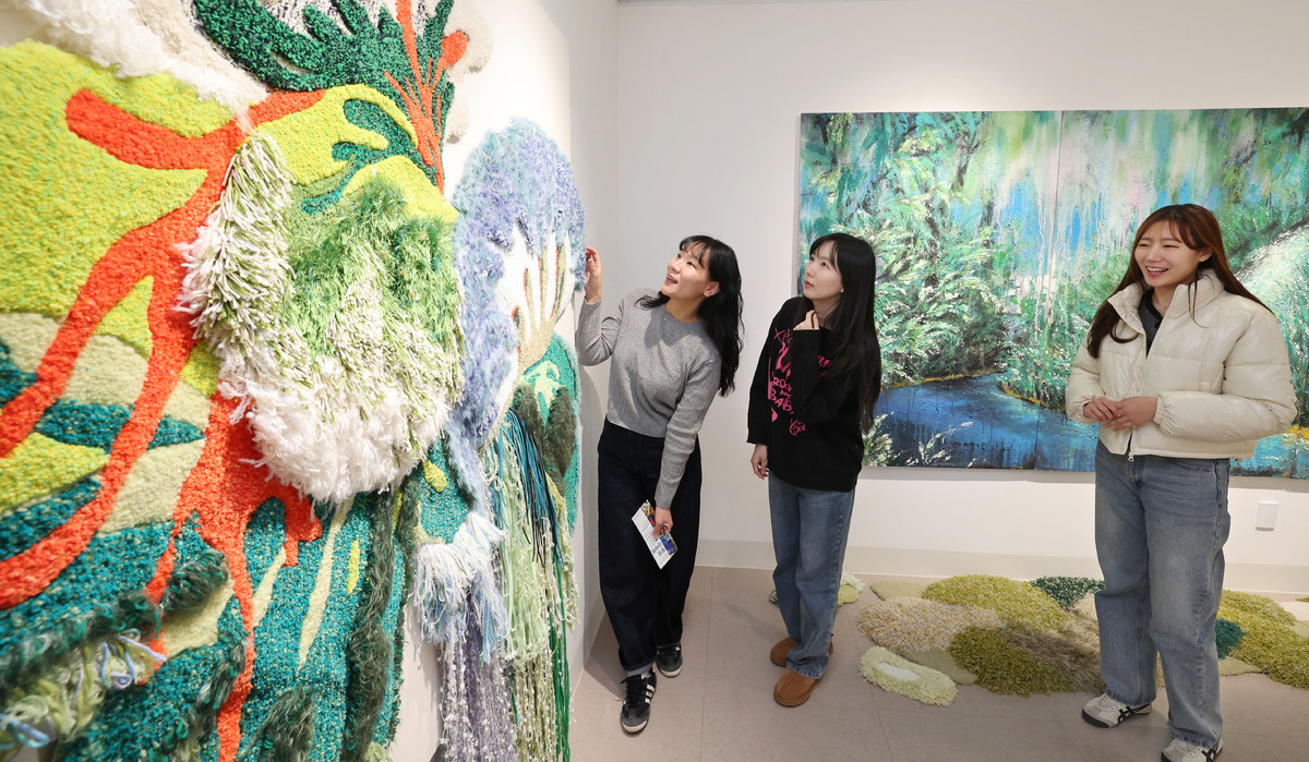 24일 서울 노원구 중계동 불암산아트포레 갤러리를 찾은 관람객들이 터프팅(Tufting) 기획전 「밀실 각자의 방」 전시 작품을을 관람하고 있다. 이번 전시는 박현지, 남궁아린, 박지훈, 장민석 4인의 작가가 실을 엮어 쌓아 올린 터프팅 작품으로 독특한 질감과 따스한 감성을 선보인다. 전시는 3월 22일까지 열린다.