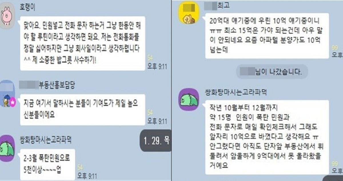앞서 지난달 29일 경기 하남시의 한 아파트단지 주민 179명이 모인 카카오톡 단체대화방에서는 집값이 10억원 아래로 내려가는 걸 막기 위해 “2~3월 폭탄 민원으로, 5000(만원) 이상 업(올립시다)”이라는 메시지가 올라오자 “소중한 밥그릇 사수!”, “총력(전)합시다” 등의 대화가 오갔다. 대화방을 개설했던 방장은 이달 초 집을 팔며 3년 만에 3억원의 차익을 남긴 것으로 전해졌다.