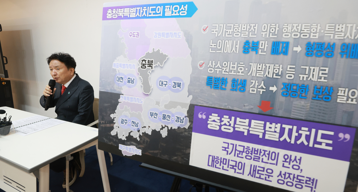 김 지사는 정부가 추진하는 5극 3특에 대한 ‘충북 소외론’도 제기했다. 3특(제주특별자치도, 강원특별자치도, 전북특별자치도)에 충북을 포함해 ‘4특’으로 해야 한다고 주장했다. 그는 “5극 3특이 없으면 충북에서 특별도법을 만들지 않고도 갈 수 있을지 모르겠는데 충북만 배제됐기 때문에 5극 4특이 최소한의 요구라고 생각한다”고 설명했다.