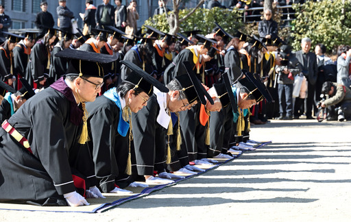 25일 서울 종로구 성균관대학교 비천당에서 열린 2026년 겨울 학위수여식에 참석한 교수진과 졸업생들이 입학과 졸업 등 학교의 경사를 선현들에게 알리는 의식인 고유례(告由禮)를 지내고 있다.