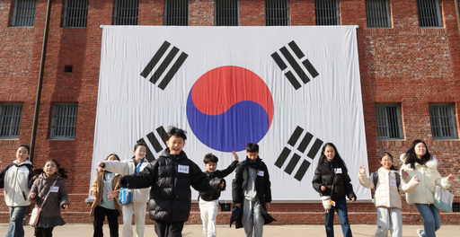 3·1절을 사흘 앞둔 26일 서울 서대문구 서대문형무소역사관을 찾은 어린 학생들이 대형 태극기를 배경으로 만세를 외치고 있다.