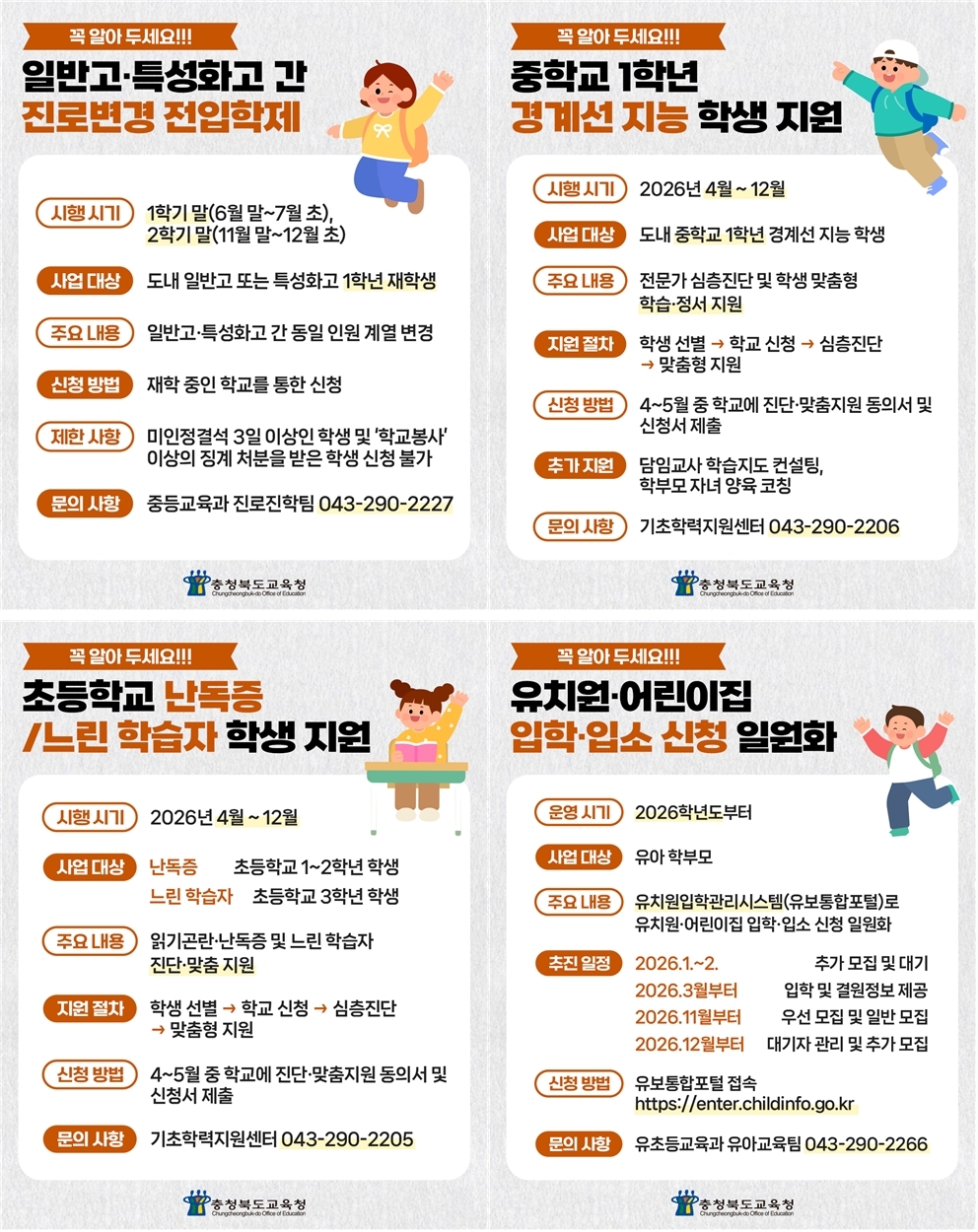 여기에 난독증∙느린 학습자∙경계선 지능 학생 지원, 일반고·특성화고 간 진로변경 전입학제 운영, 교육비 및 현장체험학습비 지원 등 맞춤형 정책이 단계적으로 추진한다. 도교육청 관계자는 “이번 교육 시책 개편은 학생 한 명 한 명의 상황을 세심하게 살피겠다는 충북교육의 방향성을 반영한 것”이라며 “앞으로도 현장의 목소리를 반영해 학생 중심의 교육복지 체계를 지속해서 보완해 나가겠다”고 말했다.