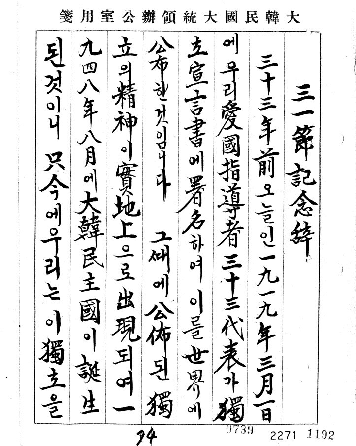 “그때 공포된 독립의 정신이 실지상으로 출현돼 1948년 8월 대한 민주국이 탄생된 것이다.”(1952년 이승만 대통령 삼일절 기념사)