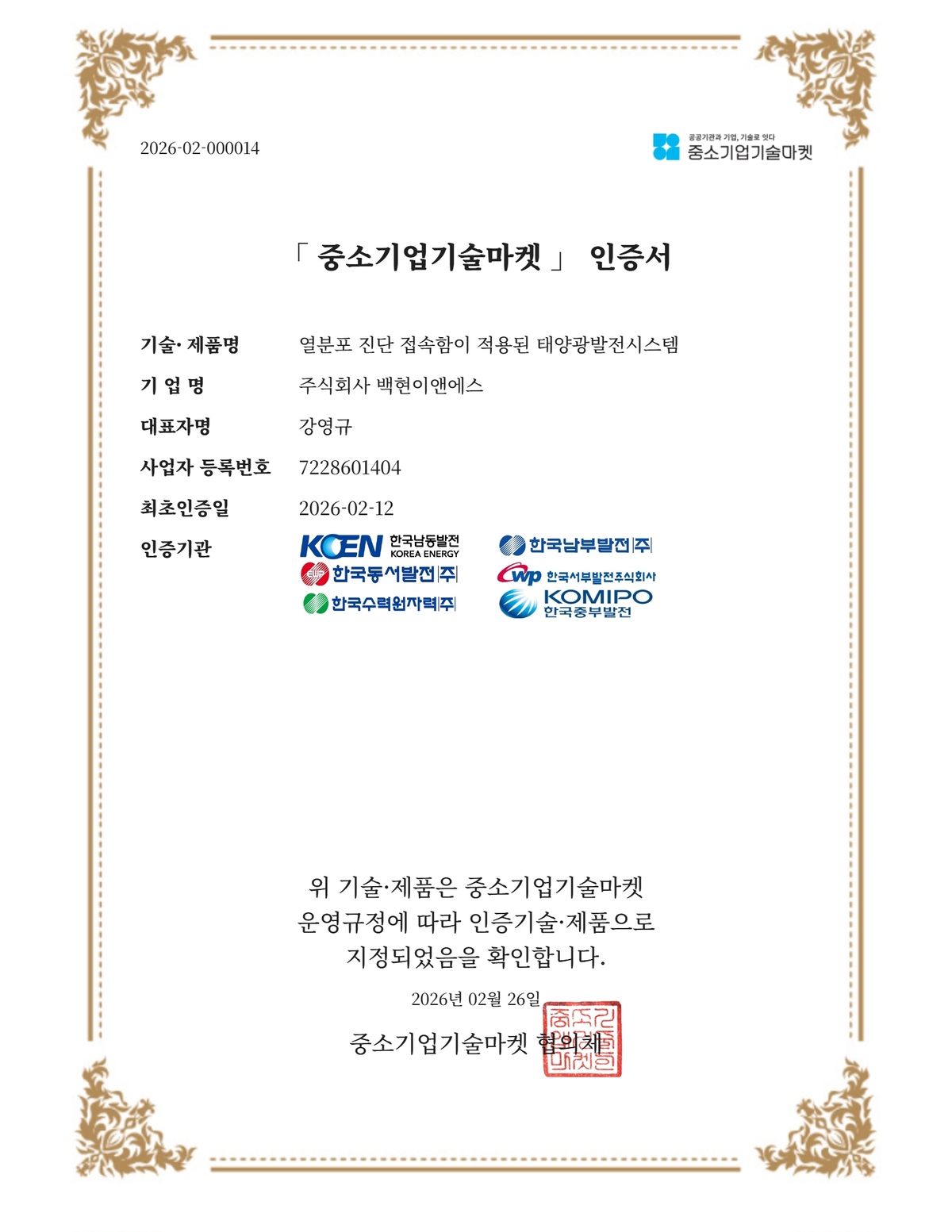 ㈜백현이앤에스 강영규 대표는 “이번 중소기업기술마켓 인증은 현장 최일선에 있는 발전 공기업 전문가들로부터 당사 기술의 신뢰성을 인정받았다는 점에서 의미가 크다”며 “특히 아이들이 생활하는 학교나 시민들이 이용하는 공공시설에서 태양광 화재 우려를 완벽히 해소할 수 있도록, 설비 화재를 원천 차단하는 데 앞장서겠다”고 강조했다.