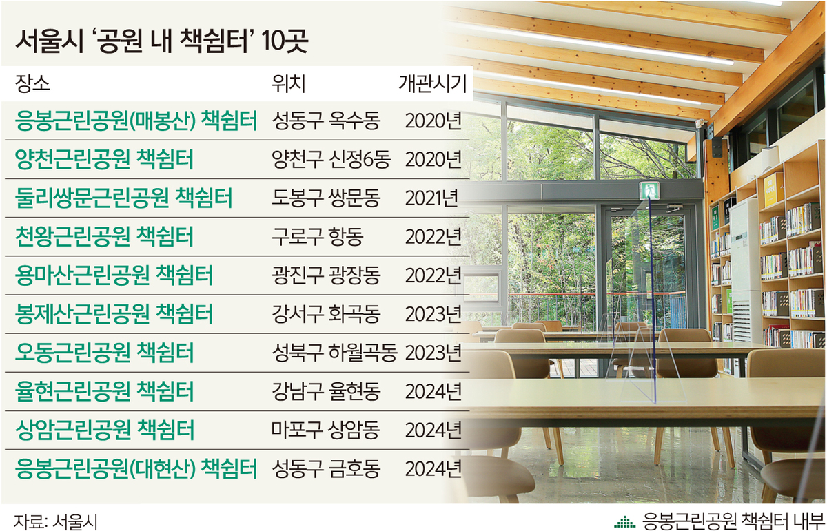 실제 지난달 25일 찾은 응봉근린공원 책쉼터에는 평일(수요일) 오후였지만 자리가 꽉 찰 정도로 이용객이 많았다. 특히 공원 전경을 보며 책을 읽을 수 있는 창가 자리는 매일 꽉 찰 정도로 인기가 좋다는 전언이다. 책쉼터 관계자는 “대체로 숲 주변에 아파트 주민들이 많이 찾는다”며 “주말에는 다른 지역에 사는 가족 단위로 나들이를 오는 경우도 많다”고 설명했다.