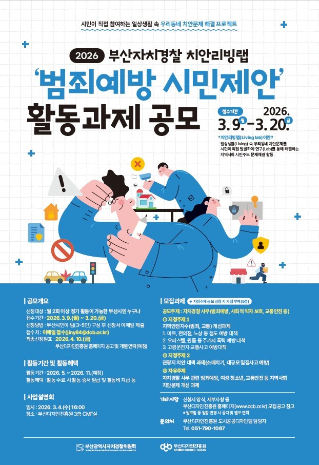 부산시 자치경찰위원회는 9일부터 다음달 20일까지 부산디자인진흥원과 공동으로 ‘2026년 부산자치경찰 치안리빙 공모전’을 개최한다고 4일 밝혔다.