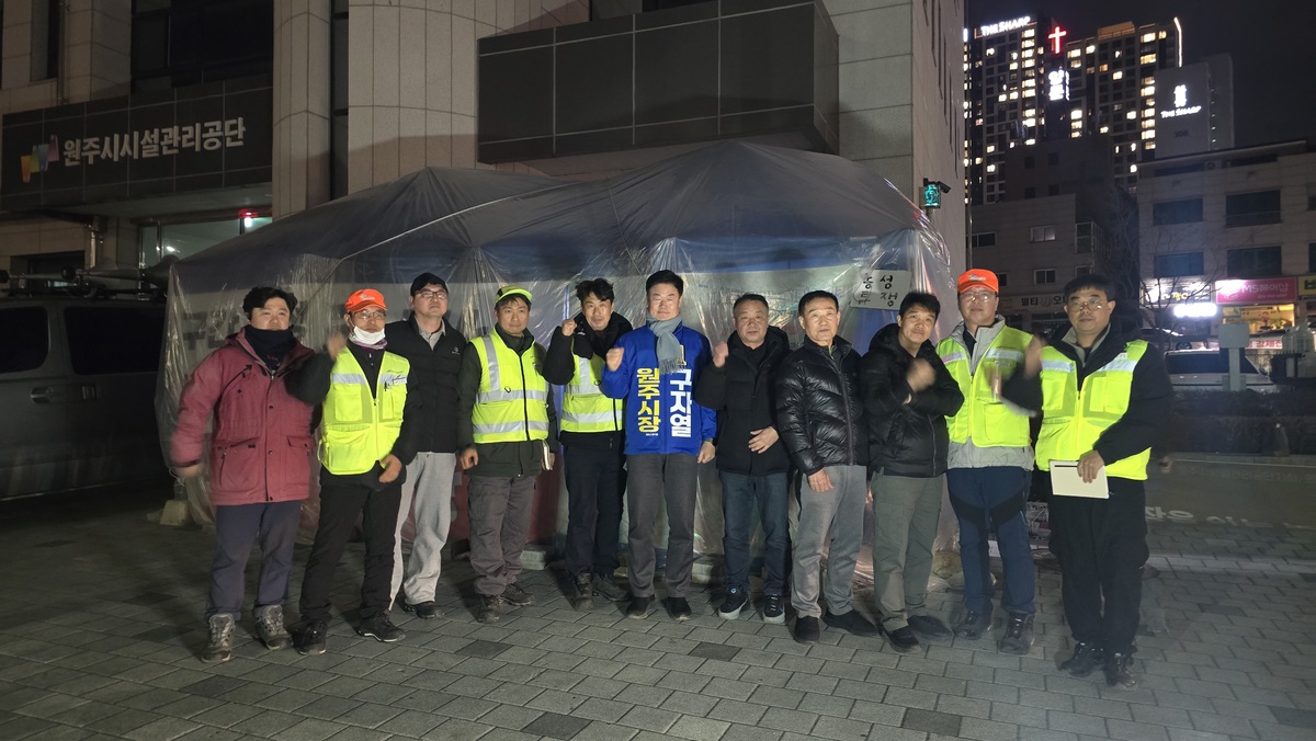 구자열 원주시장 예비후보가 3일 천막농성을 이어가고 있는 원주시설관리공단 노동자들을 만나 갈등 해결 방안을 모색했다.
