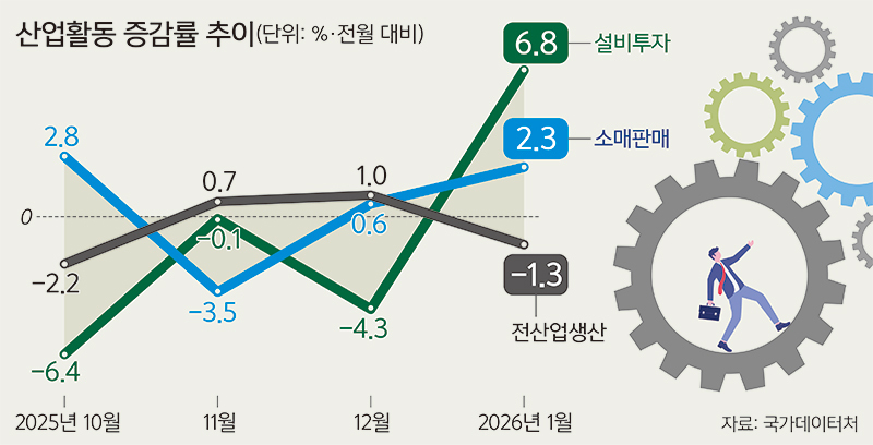 다만 투자 지표는 업종에 따른 희비가 엇갈렸다. 설비투자지수는 6.8% 증가했는데, 지난해 9월(8.1%) 이후 넉 달 만에 플러스로 전환했다. 자동차 등 운송장비(15.1%) 투자가 상승세를 견인했고, 반도체 제조용 기계 등의 기계류가 4.0% 증가했다.