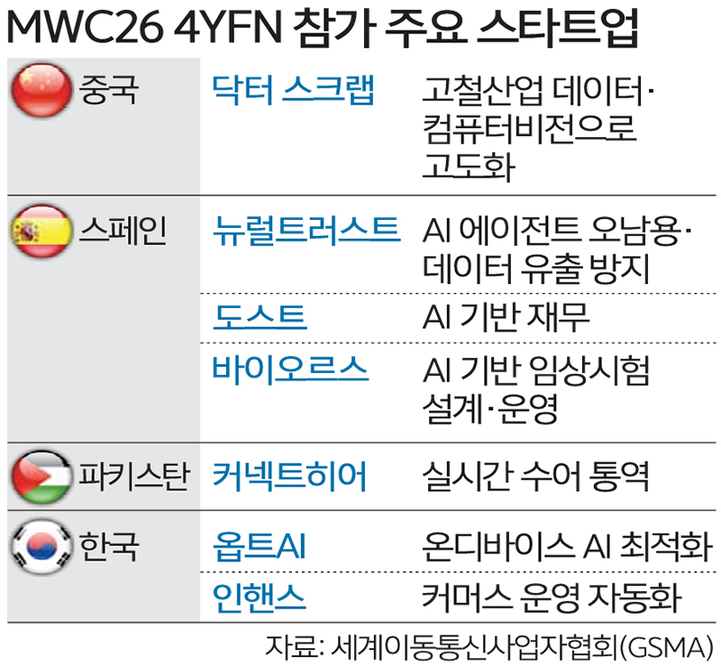 4일(현지시간) 세계이동통신사업자연합회(GSMA)에 따르면 MWC26 부대행사인 ‘4YFN’ 어워즈 결선에 스타트업 5곳이 올랐다. 4YFN은 4년 뒤 MWC 본 전시에 참여할 잠재력을 가진 유망 스타트업을 발굴·지원하는 행사다. 올해 4YFN 주제는 ‘인피니트 AI’로, AI 기술이 애플리케이션(앱) 등 단순 기능을 하는 걸 넘어 산업 전반에 스며들어 무한히 확장한다는 뜻이다.