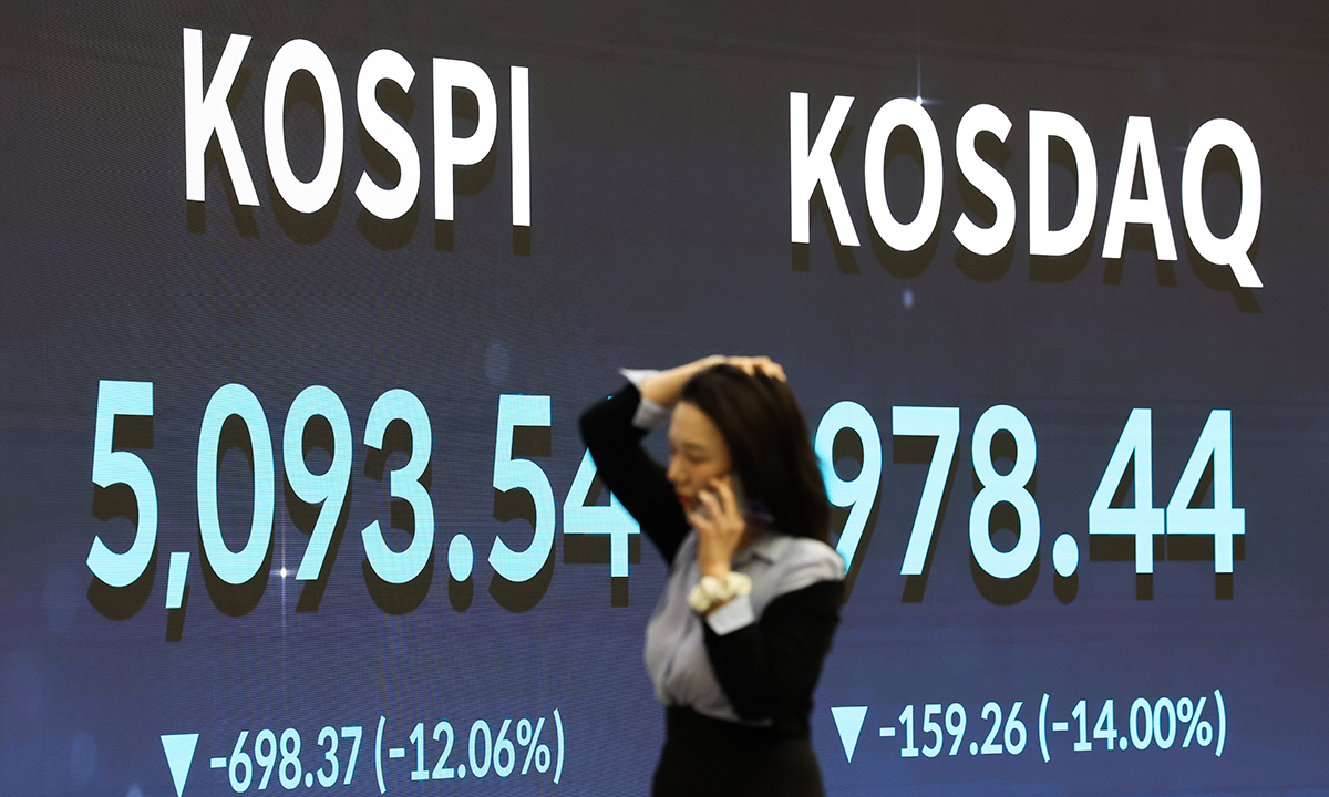 한국거래소에 따르면 이날 코스피 지수는 전장보다 698.37(12.06%) 내린 5093.54에 정규장을 마치며 올해 1월 말 수준으로 되돌아가는 급락세를 보였다. 지수는 장중 732.46(12.65%) 하락한 5059.45까지 밀렸는데, 이는 1998년 한국거래소가 집계를 시작한 이후 포인트·하락률 모두 사상 최대 낙폭이다. 전 세계 주요 국가 지수 중에서도 전날에 이어 낙폭이 가장 컸다.